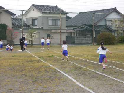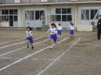 1、2年生は、合同で体育の学習を行っていきます。今日は、50メートル走の記録を計測しました。