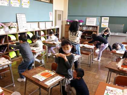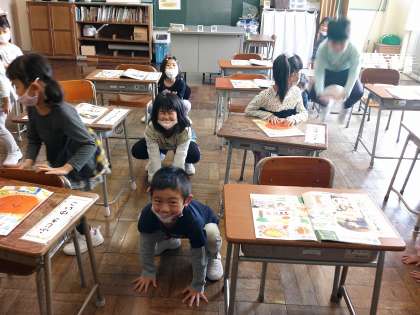今日は「かきたいものなあに」という学習をしました。教科書に書いてある動物や食べ物の真似をしながら、自分の書きたいものを考えました。