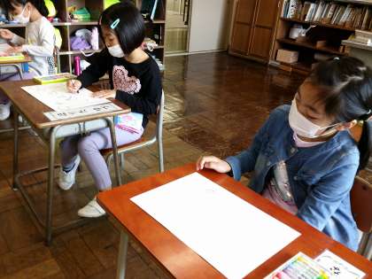 自分の描きたいものを考えて描きました。「ハロウィンの様子を描きたいな」「わたしはおばけを描くよ」「わたしはお花畑でピクニック」と思い思いの絵を描くことができました。