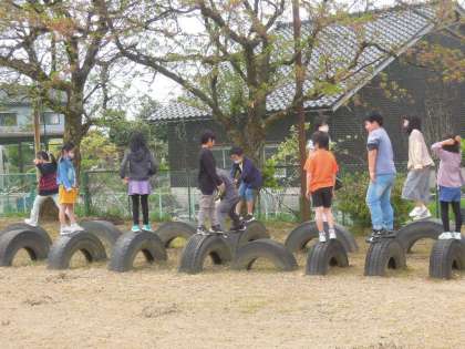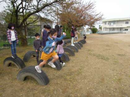今日の「いきいきタイム」(2限と3限の間の大休憩)は、タイヤ跳びが大人気です。