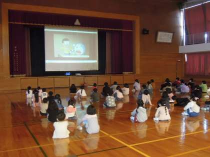 お家の人が学級懇談会をしている間、子供たちは体育館に集まって、ビデオ鑑賞をしています。