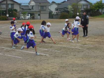 1、2年生は、合同でリレーのバトンパスの練習をしています。