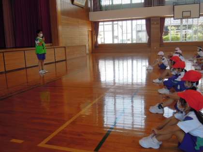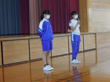 委員会発足式を行いました。児童会長から今年度の児童会スローガンが発表され、それを受け、各委員長から方針や方策の発表がありました。