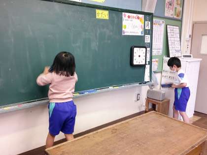 1年生は毎日、当番活動をがんばっています。健康観察板を取りに行ったり、配付物が入ったボックスを確認したり、黒板を消したりする当番があります。自分の当番を確認し、進んで動くだけでなく、「〇〇さん、当番だよ」と優しく教え合う姿や当番の代わりに働く子供の姿も見られます。1年生みんなががんばっているおかげで、真剣に学習に臨むことができます。