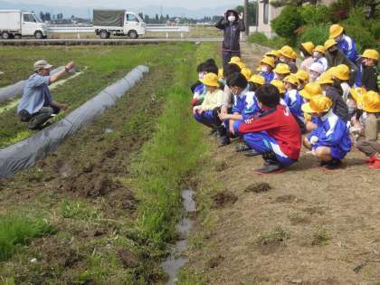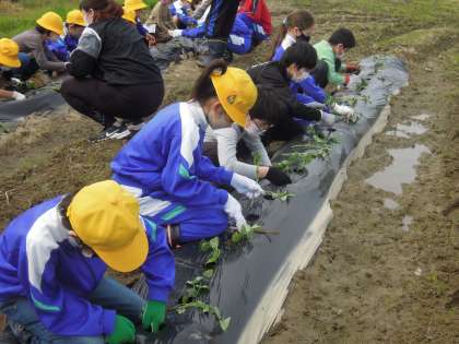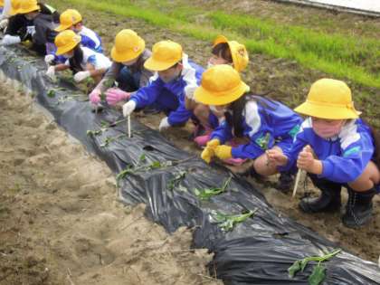 グリーンパワーさんから、植え方を教わってから、全校児童でサツマイモの苗植えをしました。子供たちは、畑に向かう前から、あたかも遠足に行くかのようにワクワクする気持ちが抑えきれない様子でした。無事に苗を植え付け、収穫の秋が楽しみです。グリーンパワーさんには、今日だけでなく、これまで、畑を耕し畝を作りマルチシートをかけるまで、たくさんお世話になっております。ありがとうございます。今後ともよろしくお願いします。