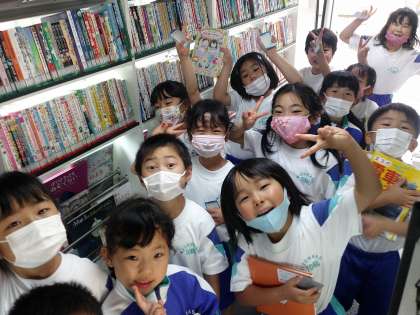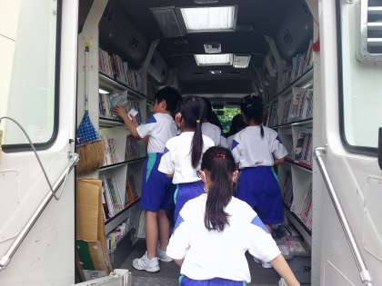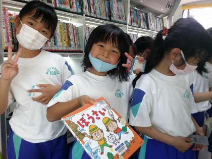 自動車文庫の様子です。初めての自動車文庫に「動く図書館だ!!!」と大喜びの子供たち。自分のお気に入りの本を見付け、借りることができました。