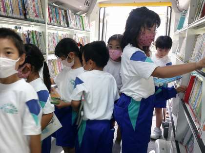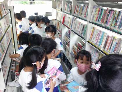 自動車文庫の様子です。借りるときには、バーコードをきちんと並べたり、「お願いします」や「ありがとうございます」など大きな声であいさつをしたりするなど、図書室オリエンテーションでの学びを生かしていました。