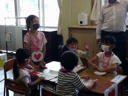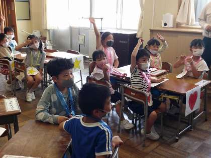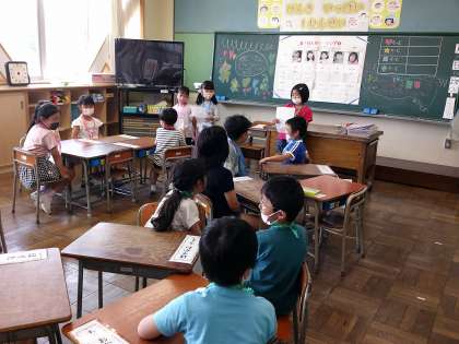 「なかよしクイズ」では、ヒントをたよりに、友達の好きな食べ物やキャラクターを答えました。1年生も2年生もみんな笑顔で楽しむことができました。