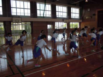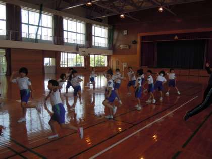 2、3年生は、合同で体育の学習です。今日からスポーツテストが始まります。ボールの投げ方の基本を教わっています。
