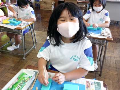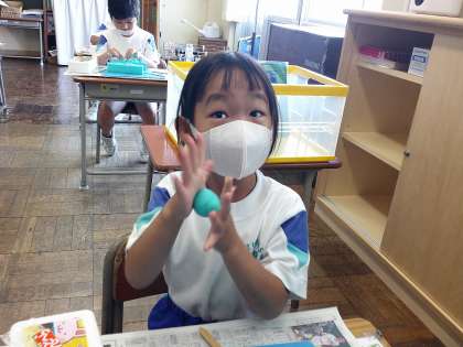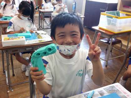 図画工作科では「すなやつちとなかよし」という学習をしています。今日は初めて粘土を使い、思い思いの作品をつくりました。