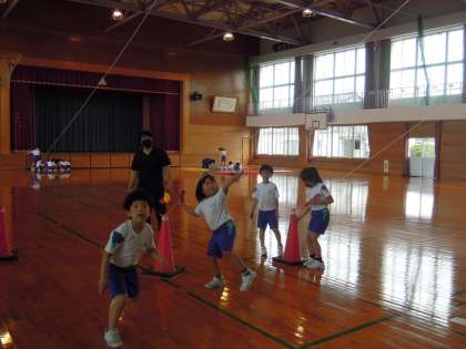 2、3年生の体育の学習です。それぞれ、ソフトボール投げや立ち幅跳びの記録更新に向け、投力・跳力を向上させようとトレーニングしています。