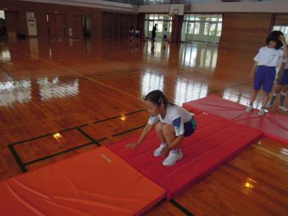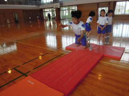 2、3年生の体育の学習です。それぞれ、ソフトボール投げや立ち幅跳びの記録更新に向け、投力・跳力を向上させようとトレーニングしています。