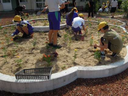 チューリップが咲き誇っていた花壇に、新たな花の苗を植えました。3、5、6年生の担当は、MTガーデン(中庭)です。