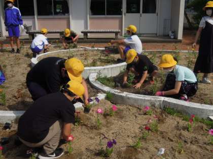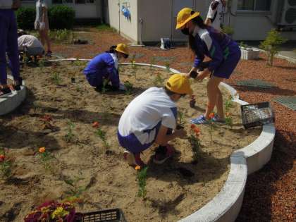 チューリップが咲き誇っていた花壇に、新たな花の苗を植えました。3、5、6年生の担当は、MTガーデン(中庭)です。