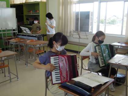 6年生の音楽の授業は、5年生の担任の先生が担当しています。学年全員合奏に向けて、今は「ラバースコンチェルト」の個人練習中です。
