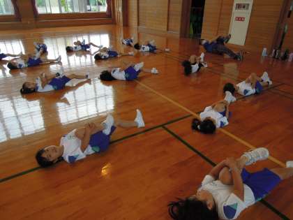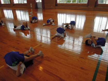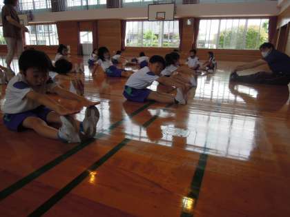 2年生との合同体育。みんなでストレッチをしています。