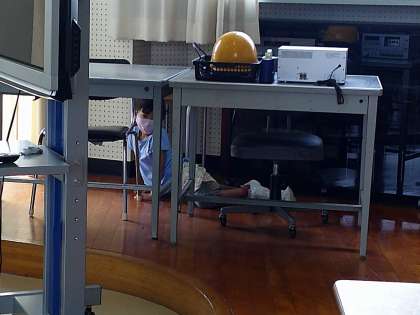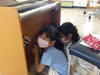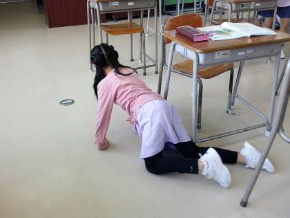 音楽では「はくにあわせてリズムをうとう」の学習をしています。授業の始めには、かたつむりになりきって歌を歌いました。ゆっくり動いたり隠れたりするなど、動きを工夫する子供の姿がたくさん見られました。