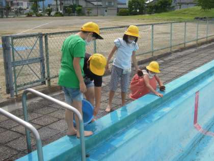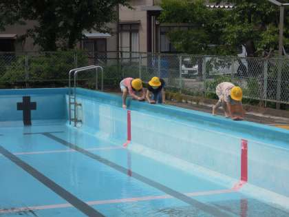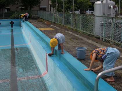 5、6年生が本格的にプール掃除をする前に、3年生は一足先に、オーバーフロー部分をたわしを使ってきれいにしました。