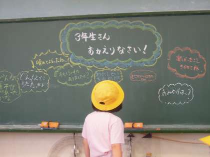 3年生が無事、校外学習を終えて帰ってきました。教室に入ると、黒板に他の学年からのメッセージが・・・温かい心が伝わってきます。