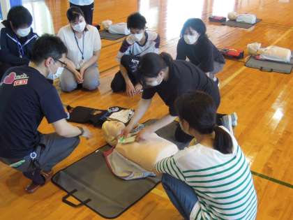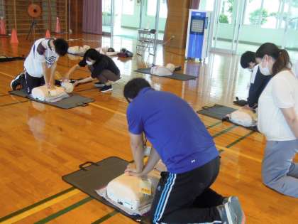 株式会社エムテックの山根様を講師にお招きし、心肺蘇生法講習会を行いました。教職員や保護者のみなさんは、真剣に説明を聞いた上で、AEDの使い方を確認したり、ペアになって胸骨圧迫の練習をしたりしました。