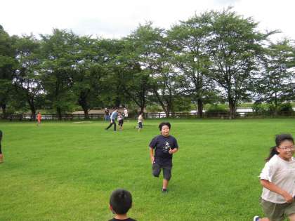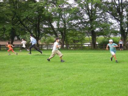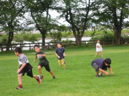弁当が食べ終わったら、不思議と気温が少し下がり適度な風も吹いていました。子供たちは、鬼ごっこなど、縦割り班ごとに思い思いの遊びを楽しみました。