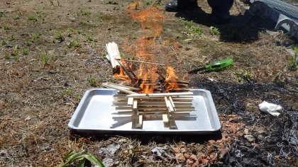 今日の理科の学習では、火を使った実験をしました。割り箸をまとめたものと互い違いに組み立てたものに火をつけ、燃え具合を確かめました。空気が入れ替わりやすい互い違いの物の方がよく燃えることに気付きました。
