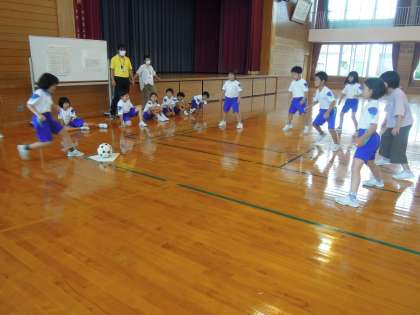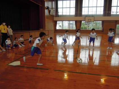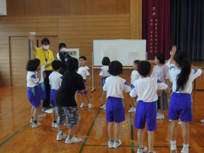 2、3年生は合同体育で、「キックベースボール」をしています。みんなが楽しめるようにルールは易しくなっています。ボールを蹴る強さや方向、守る場所などに工夫が見られます。