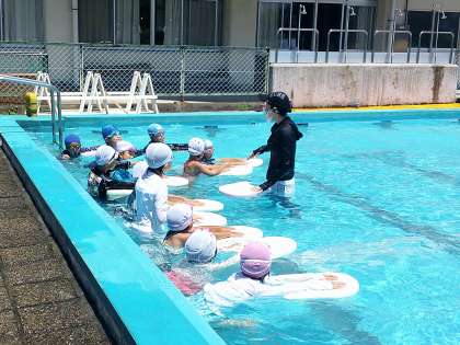 体育の時間には、水泳指導教室で教えてもらったことを生かして、練習をしています。「水が怖くなくなったよ」と笑顔で話す子供もいます。少しずつ水に慣れていきたいと思います。