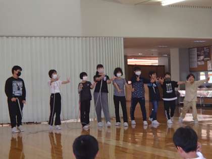二日目の朝は、杉原小学校のみなさんと朝のつどいを行いました。一緒にラジオ体操をしたり学校紹介をしたりしました。水橋東部小学校は、なわとび発表会について紹介し技を披露しました。