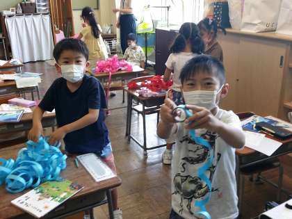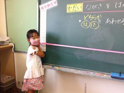 リボンに長さを測りとる活動を通して「この方法だったら、曲がっているものも測れるね」とリボンを使う良さに気づいていました。