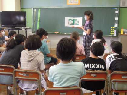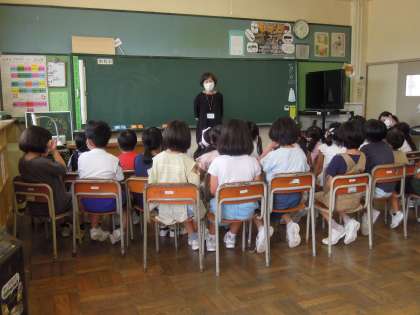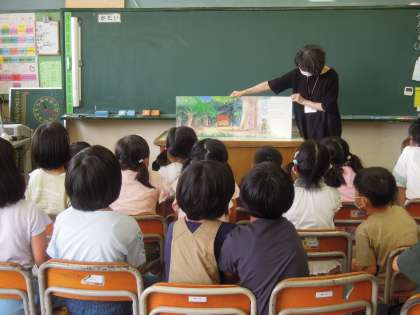 読書タイム、市立図書館よみきかせの会の方に来校頂き、読み聞かせをしてもらいました。図書室にない大きな絵本も読んでいただき、子供たちは真剣に聞き入っていました。