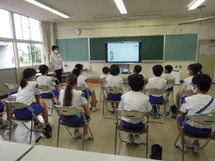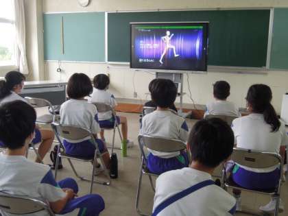 昨年度に引き続き、今年度も水橋中学校から保健体育科の五十里先生に来ていただき、5、6年生陸上教室を開きました。まずは、速く走るためのイメージをもつために、動画を見せていただきました。