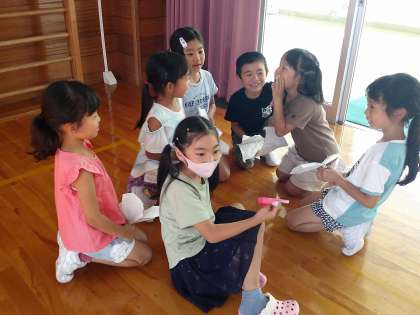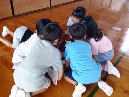 学級活動では、「紙飛行機対決」をしました。自分たちで折った紙飛行機を使っての勝負です。グループの友達と投げる順番を相談し、真剣勝負が始まりました。