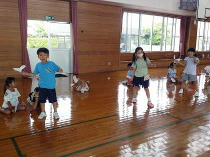 互いに応援し合いながら、紙飛行機を飛ばしました。みんなの楽しそうな表情をたくさん見ることができました。