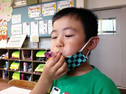 休み時間には、あさがおの本を読む子供たちの姿がありました。「いろんなあさがおがあるんだね」「いろんな色や形の花があるんだね」とたくさんの発見をしたようです。また、「あさがお風船」というものを発見した子供たち。しぼんだあさがおに、息をフウッと吹き込むと、風船のようにふくらむそうです。気が付くと、本物のあさがおで試していました。いろいろなことに興味をもち、自分で体験してみるというのはとても大切ですね。子供たちの姿を見て改めて気付くことができました。