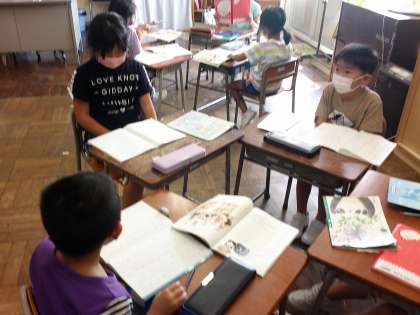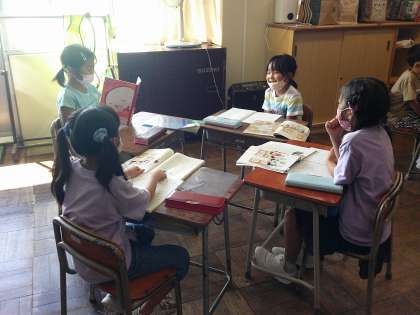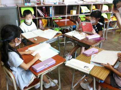 国語科では、夏休みの思い出を絵日記にまとめるための学習をしています。今日は、グループの友達と思い出を聞き合いました。