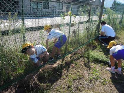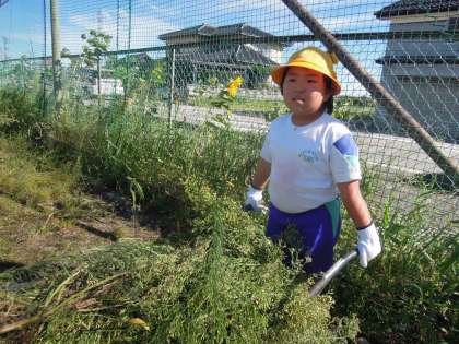 この夏、きれいに咲き誇っていたひまわり。2年生は、そのひまわりロードの草や枯れてしまったひまわりを片付け、きれいにしました。ひまわりは、たくさんの種を付けていました。