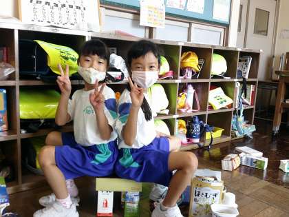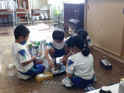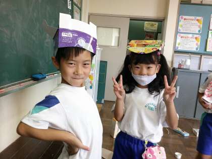 帽子に見立ててかぶったり、線路や電車をつくったりしました。中には、箱を上手に組み合わせて椅子をつくる子供もいました。のりやガムテープを使わず、2人がけの頑丈な椅子を作る子供たちに感心しました。