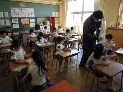 1、2年生は合同で生活科をします。今日から、「みんなと とばして たのしもう」の学習に入ります。傘袋を飛ばして楽しむ学習ですが、今後どのような工夫が見られるでしょう。楽しみです。