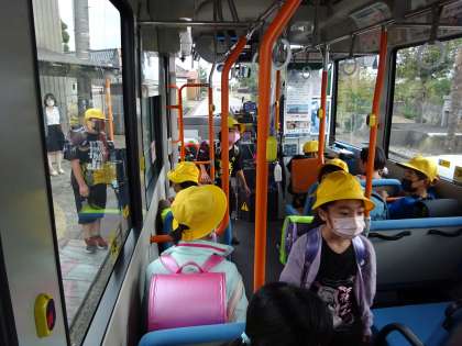 コミュニティバス(モーニング便)を利用して登校してくる子供たちです。