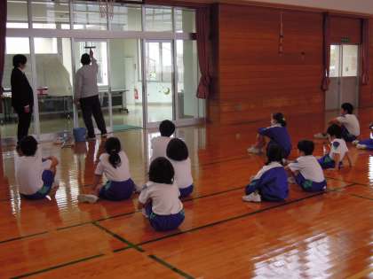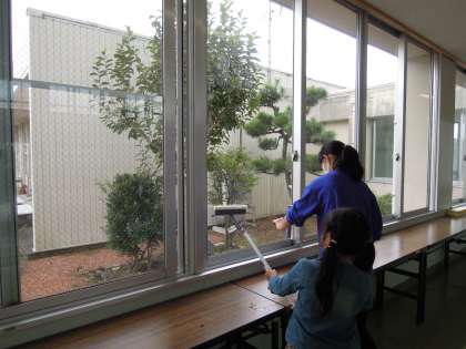 休み時間、用務員さんからお掃除ワイパーを使った窓ふきの仕方を教わりました。