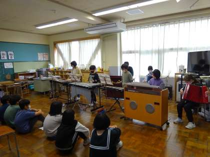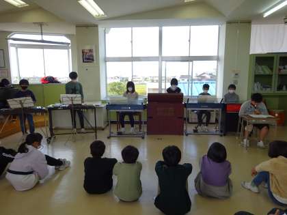 今日は、教職員を招待して発表会を行い、互いに感想を伝え合いました。中間発表会の時に比べ、強弱を工夫したり、イメージに合う楽器に変更したりするなど、随分、植村直己さんの冒険のイメージが伝わってきました。