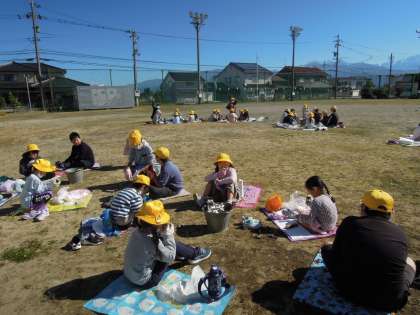 大休憩時、縦割り班ごとにレジャーシートを敷いて焼きいもを食べます。