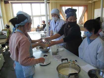 大豆から豆腐を作る手順を教えていただき、自分たちで調理しました。