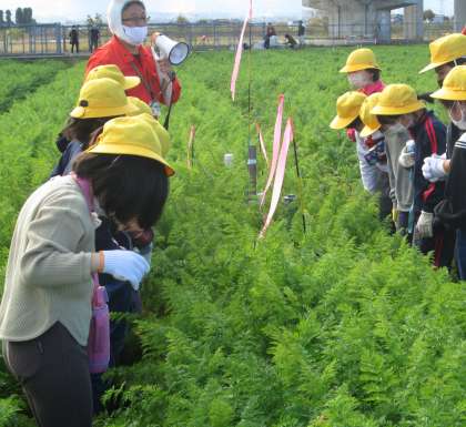 今日は総合的な学習の時間で、サイフォン等特別な仕組みを利用したにんじん畑を調査しにいきました。