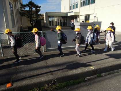 1、2年生がコミュニティバスに乗って校外学習に出かけました。学校に残る教職員に見送られて出発です。この後、「あいのかぜ富山鉄道」を利用して富山駅周辺まで向かいます。