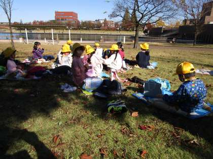 ドングリやキノコを見つけて、熱心に観察したり、噴水の周りにいる水鳥の数を数えたり、気持ちよく過ごしていました。