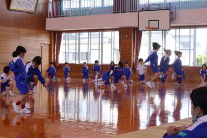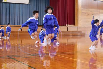 ペア跳びの様子です。友達と心を合わせ、タイミングよくジャンプしました。跳びながらくるっと一回転したり、前跳びと後ろ跳びを組み合わせたりするなど、自分たちにできる技を一生懸命考え、今日の技ができあがりました。子供たちは練習の成果を発揮することができて嬉しそうな表情を見せていました。