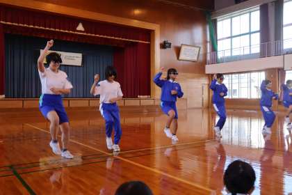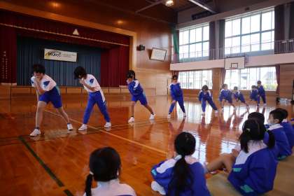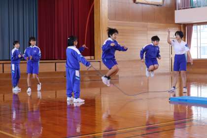 学年ごとの演技では、ダブルダッチに挑戦しました。演技の内容や構成は、ほぼ子供たちが考えました。元気さや、なわとびを楽しんでいる様子が伝わる演技を目指し、力を合わせてがんばりました。
