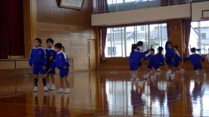 1年生の「8の字跳び」の様子です。練習を始めた頃は、連続で入り続けることが難しく、何度も悔しい思いをしてきました。子供たちはその悔しさをバネに、声をかけ合ったり、縄の回し方を考えたり、友達の背中を優しく押してタイミングを伝えたり、たくさんの工夫をしてきました。今日はその成果が発揮され、全員連続で入り、ジャンプすることができました。